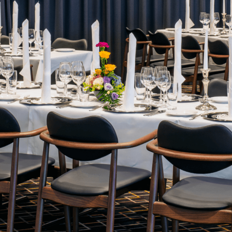 Det er netop til Banketten, at Ro Collection har leveret de smukke Regatta-stole med polstret sæde og ryg i læder. Stolene er udvalgt for at sikre den rette kombination af komfort og æstetik.