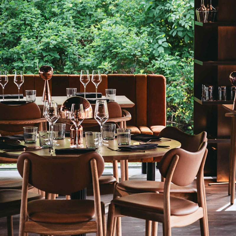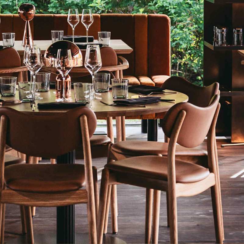 Regatta Chair, i olieret egetræ med polstret sæde og ryg i smukt læder, tilbyder både komfort og karakter. De bløde kurver og den varme farve spiller naturligt sammen med restaurantens æstetik, der balancerer det rå og det forfinede.