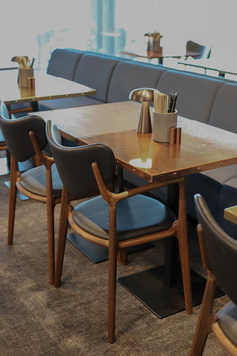Ro Collection has supplied 42 Salon chairs to Scandic Opus Horsens' restaurant and dining areas. These chairs, crafted in smoked oak with standard black leather, add a luxurious and modern aesthetic to the hotel's elegant surroundings. The chairs are designed to offer both comfort and style, making them ideal for the hotel's exclusive environment.