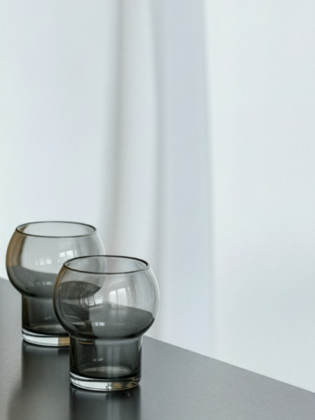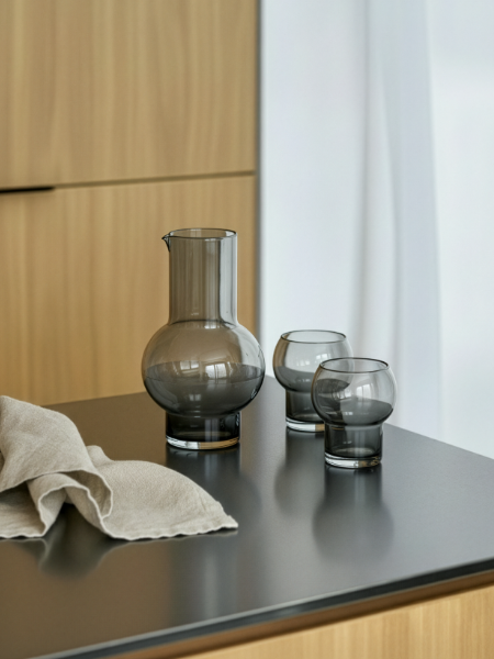 Carafe no. 49 and Glass no. 48 are a sculptural and harmonious pair in mouth-blown glass. Created in a timeless, smoky gray, the entire series appears as an elegant whole, adorning every everyday or festive dinner table with stylish, inspiring bubbles.