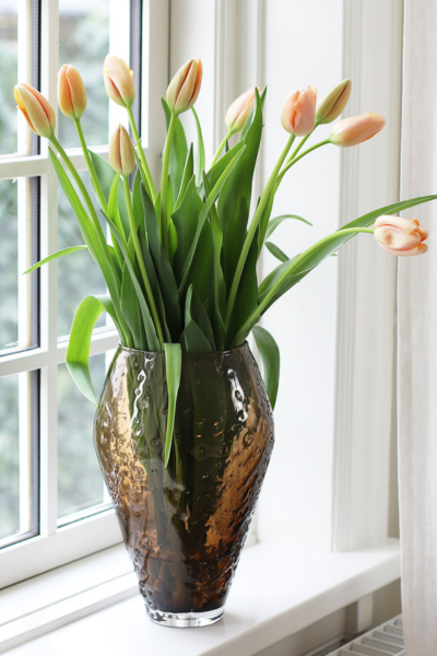 Crushed Glass Vase towers stunningly in an elegant and impressive shape, and with a narrowing opening beautifully presents both larger and medium-sized flower bouquets.