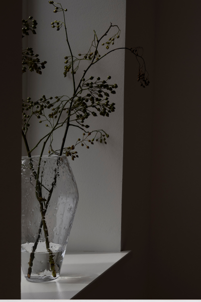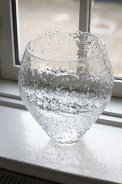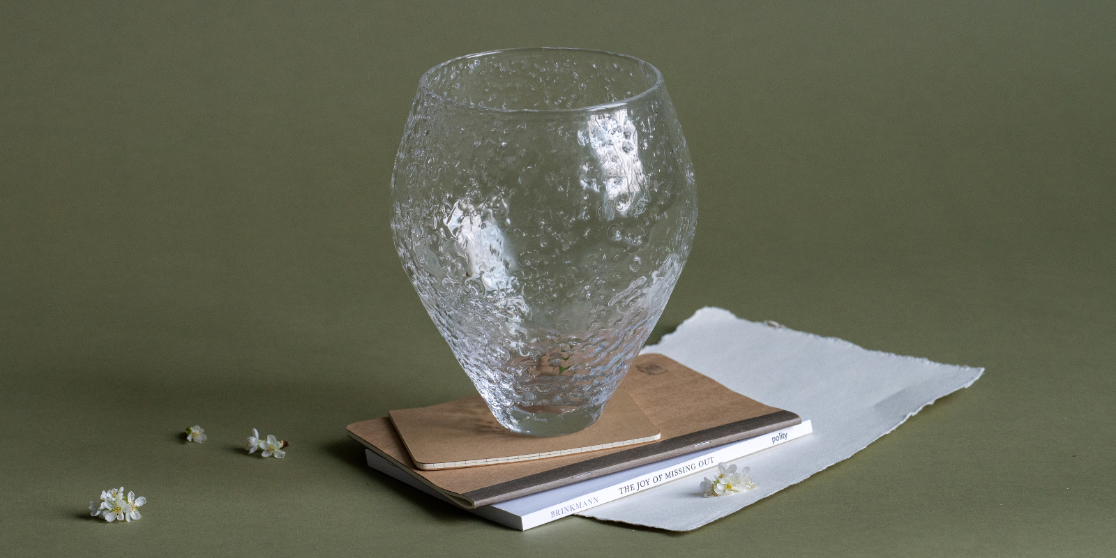 Crushed Glass Vase is a unique series of mouth blown glass vases that portrays a traditional glassblowing technique with recycled residual glass. Here, molten glass is mouth blown into the desired vase shape before turned in crushed residual glass that melts into the surface and creates a unique and fascinating texture. To create the most beautiful expression, the Crushed Glass vase is therefore carefully designed with soft, organic shapes to highlight the artistic qualities behind the traditional craft while joining the dual qualities of glass in one vase.
