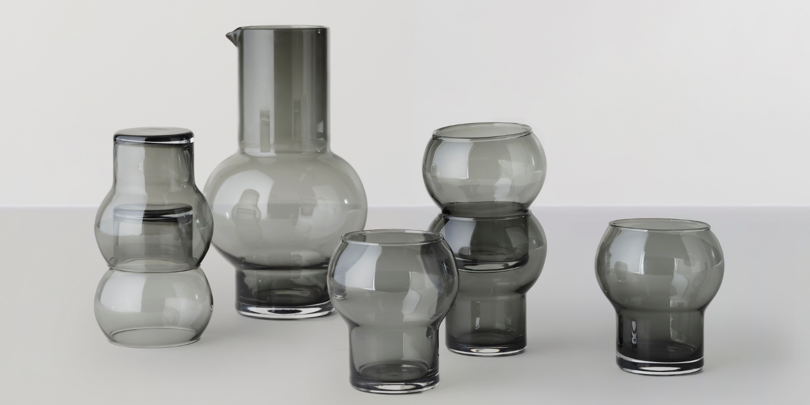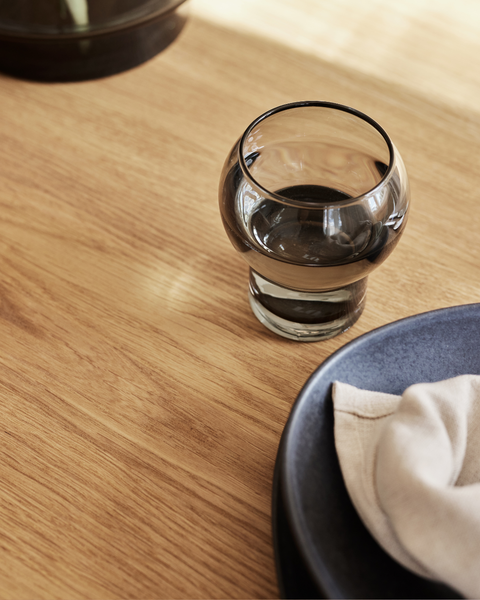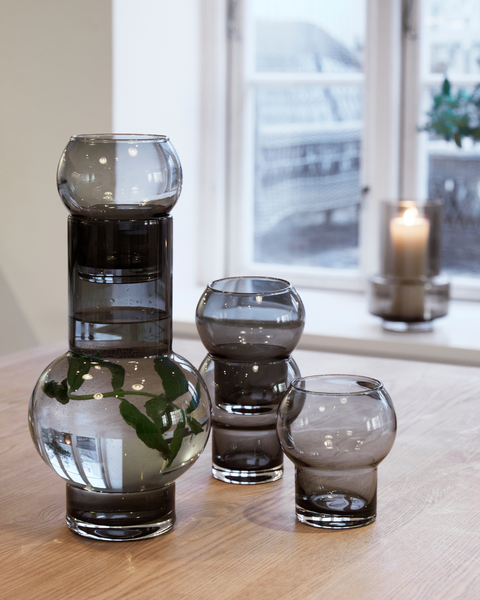 Dress the table with bobbles of mouth blown glass. Glass no. 48 is a stunning drinking glass with a sculptural expression which, in a smoky grey colour, grows from a stable cylinder to bobble into a beautiful, spherical centre. Serve chilled refreshments for the table of everyday or dinner party moments with elegant, Danish designed style.