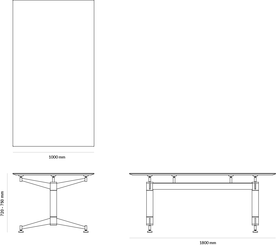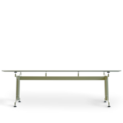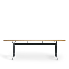 The table's functional, four-cornered frame rests on adjustable feet, which can be easily raised or lowered to accommodate chairs of varying heights or uneven floors.