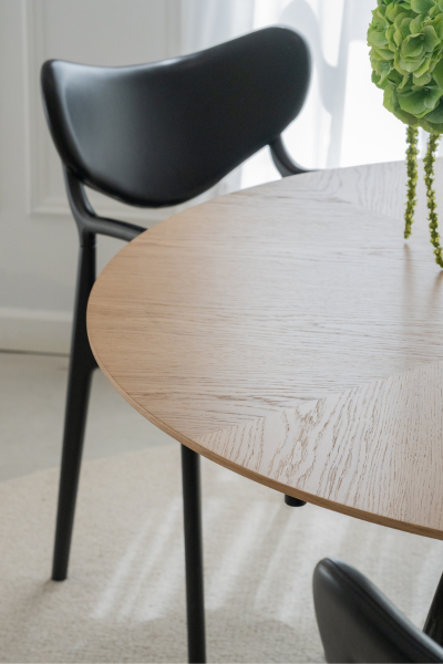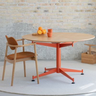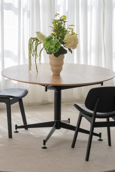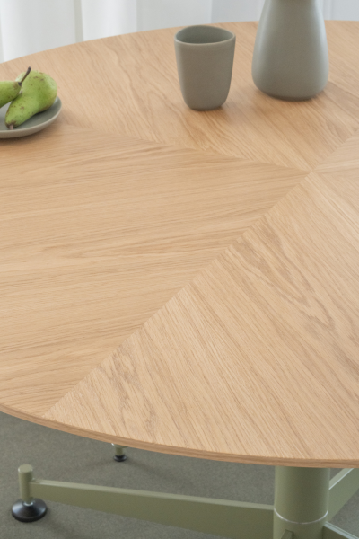 The exclusive tabletop in oak veneer is tailored in a stunning star pattern that plays with the eye when moving around the table. From above, the tabletop truly displays the mastery behind both design and craftsmanship, seamlessly coming together to shine.